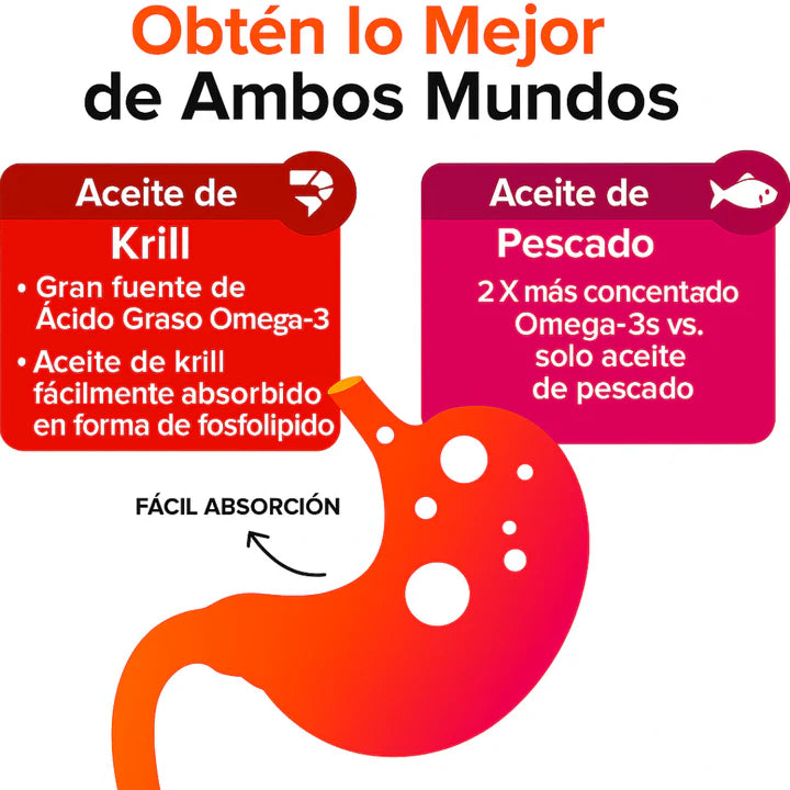 La combinación más pura y potente de omega‑3 (aceite de pescado + krill) que incrementa niveles de EPA y DHA sin sabor a pescado ni molestias digestivas.